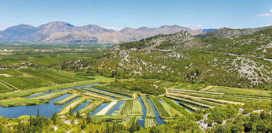 Das 12.000 Hektar große Neretva-Delta, rund 80 km nördlich von Dubrovnik, gehört zu den sonnigsten und fruchtbarsten Regionen an der kroatischen Küste. Schon die Griechen nutzten das milde Klima für den Anbau von Zitrusfrüchten. Heute ist das Delta für seine vielfältigen Zitrusfrüchte und Gemüsesorten bekannt, die bis zu dreimal jährlich geerntet werden - ein Grund, warum das Delta auch als "Kroatisches Kalifornien" bezeichnet wird.