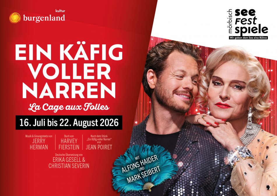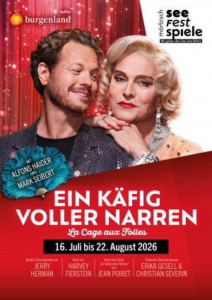 Im Sommer 2026 kommt die weltberühmte Erfolgskomödie aus den 70ern als Musical auf die Seebühne Mörbisch. Das Stück aus der Feder von Jean Poiret wurde von Jerry Herman und Harvey Fierstein zu einem Klassiker des Musical-Genres. Seit den 80er-Jahren begeistert das mitreißende Plädoyer für Toleranz, Gleichberechtigung und individuelle Freiheit das Publikum weltweit – getreu dem Motto: „Ich bin, was ich bin!“